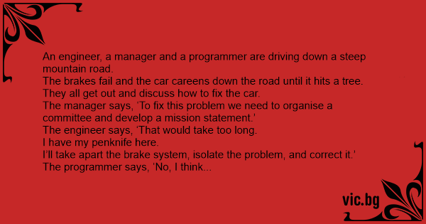 An engineer, a manager and a programmer are driving down a steep mountain road.