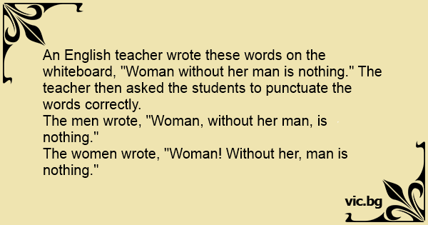 An English teacher wrote these words on the whiteboard, "Woman without her man is nothing." The teacher then asked the students to punctuate the words correctly.