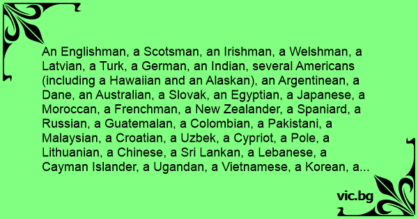 An Englishman, a Scotsman, an Irishman, a Welshman, a Latvian, a Turk, a German, an Indian, several Americans (including a Hawaiian and an Alaskan), an Argentinean, a Dane, an Australian, a Slovak, an Egyptian, a Japanese, a Moroccan, a Frenchman, a New Zealander, a Spaniard, a Russian, a Guatemalan, a Colombian, a Pakistani, a Malaysian, a Croatian, a Uzbek, a Cypriot, a Pole, a Lithuanian, a Chinese, a Sri Lankan, a Lebanese, a Cayman Islander, a Ugandan, a Vietnamese, a Korean, a Uruguayan, a Czech, an Icelander, a Mexican, a Finn, a Honduran, a Panamanian, an Andorran, an Israeli, a Venezuelan, an Iranian, a Fijian, a Peruvian, an Estonian, a Syrian, a Brazilian, a Portuguese, a Liechtensteiner, a Mongolian, a Hungarian, a Canadian, a Moldovan, a Haitian, a Norfolk Islander, a Macedonian, a Bolivian, a Cook Islander, a Tajikistani, a Samoan, an Armenian, an Aruban, an Albanian, a Greenlander, a Micronesian, a Virgin Islander, a Georgian, a Bahaman, a Belarusian, a Cuban, a Tongan, a Cambodian, a Qatari, an Azerbaijani, a Romanian, a Chilean, a Jamaican, a Filipino, a Ukrainian, a Dutchman, a Ecuadorian, a Costa Rican, a Swede, a Bulgarian, a Serb, a Swiss, a Greek, a Belgian, a Singaporean, an Italian, a Norwegian and 2 Africans...