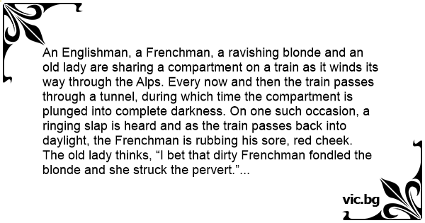 Un español, un francés, una rubia que está muy buena y una gorda van en un tren. De repente entran en un túnel, se hace la oscuridad y entonces: ¡Plas! Se escucha el sonido de una gran bofetada....
