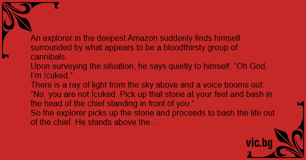 An explorer in the deepest Amazon suddenly finds himself surrounded by what appears to be a bloodthirsty group of cannibals.