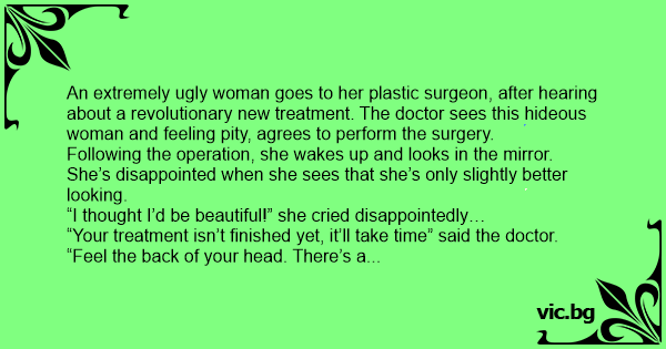 An extremely ugly woman goes to her plastic surgeon, after hearing about a revolutionary new treatment. The doctor sees this hideous woman and feeling pity, agrees to perform the surgery.