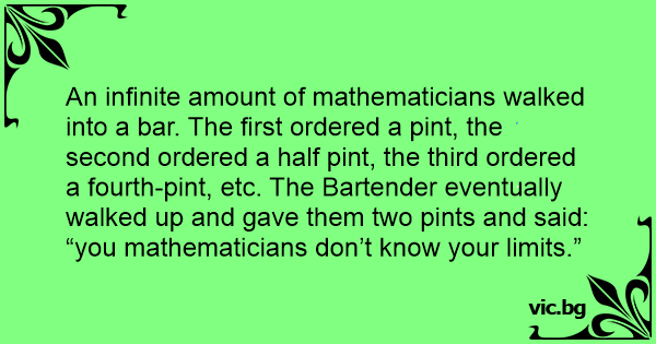 An infinite amount of mathematicians walked into a bar. The first ordered a pint, the second ordered a half pint, the third ordered a fourth-pint, etc. The Bartender eventually walked up and gave them two pints and said: