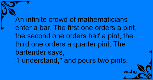 An infinite crowd of mathematicians enter a bar. The first one orders a pint, the second one orders half a pint, the third one orders a quarter pint. The bartender says,