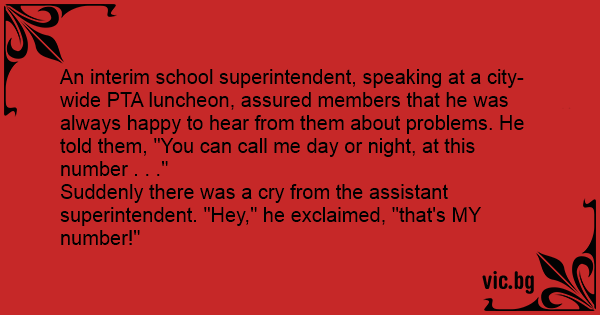 An interim school superintendent, speaking at a city-wide PTA luncheon, assured members that he was always happy to hear from them about problems. He told them, "You can call me day or night, at this number . . ."