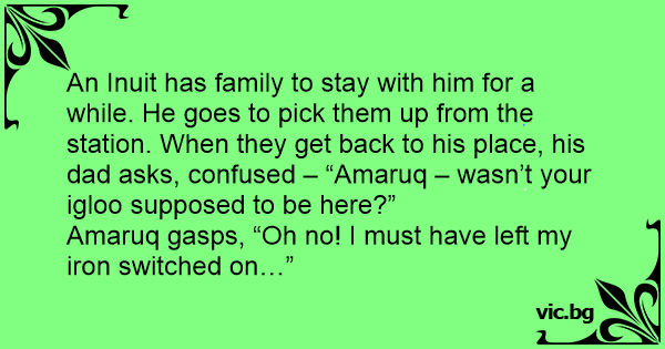 An Inuit has family to stay with him for a while. He goes to pick them up from the station. When they get back to his place, his dad asks, confused – “Amaruq – wasn’t your igloo supposed to be here?”
