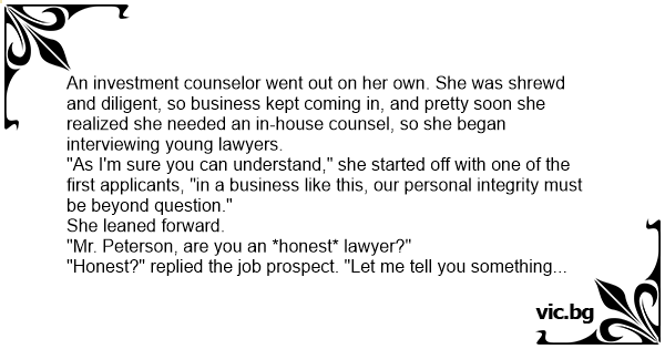 An investment counselor went out on her own. She was shrewd and diligent, so business kept coming in, and pretty soon she realized she needed an in-house counsel, so she began interviewing young lawyers.