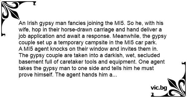 An Irish gypsy man fancies joining the MI5. So he, with his wife, hop in their horse-drawn carriage and hand deliver a job application and await a response. Meanwhile, the gypsy couple set up a temporary campsite in the MI5 car park.