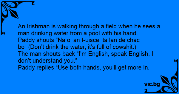 Paddy shouts “Na ol an t-uisce, ta lan de chac bo” (Don’t drink the water, it’s full of cowshit.)