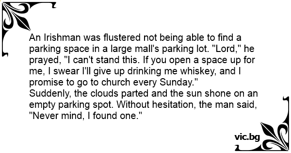 An Irishman was flustered not being able to find a parking space in a large mall's parking lot. "Lord," he prayed, "I can't stand this. If you open a space up for me, I swear I'll give up drinking me whiskey, and I promise to go to church every Sunday."