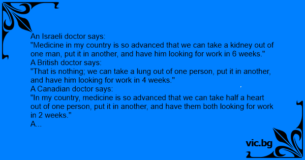 An Israeli doctor says: "Medicine in my country is so advanced that we can take a kidney out of one man, put it in another, and have him looking for work in 6 weeks." A British doctor says: "That is nothing; we can take a lung out of one person, put it in another, and have him looking for work in 4 weeks." A Canadian doctor says: "In my country, medicine is so advanced that we can take half a heart out of one person, put it in another, and have them both looking for work in 2 weeks." A Nigerian doctor, not to be outdone, says: "You guys are way behind...... We just took a man with NO brain, made him President, and now the whole country is looking for work.