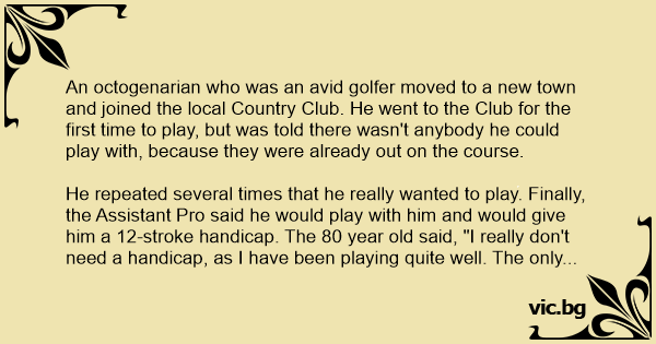 He repeated several times that he really wanted to play. Finally, the Assistant Pro said he would play with him and would give him a 12-sтrоке handicap. The 80 year old said, "I really don't need a handicap, as I have been playing quite well. The only real problem I have is getting out of sand traps."