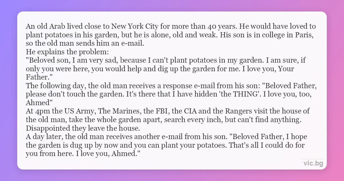 An old Arab lived close to New York City for more than 40 years. He would have loved to plant potatoes in his garden, but he is alone, old and weak. His son is in college in Paris, so the old man sends him an e-mail. He explains the problem: "Beloved son, I am very sad, because I can't plant potatoes in my garden. I am sure, if only you were here, you would help and dig up the garden for me. I love you, Your Father." The following day, the old man receives a response e-mail from his son: "Beloved Father, please don't touch the garden. It's there that I have hidden 'the THING'. I love you, too, Ahmed" At 4pm the US Army, The Marines, the FBI, the CIA and the Rangers visit the house of the old man, take the whole garden apart, search every inch, but can't find anything. Disappointed they leave the house. A day later, the old man receives another e-mail from his son. "Beloved Father, I hope the garden is dug up by now and you can plant your potatoes. That's all I could do for you from here. I love you, Ahmed."