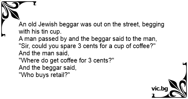 A man passed by and the beggar said to the man, "Sir, could you spare 3 cents for a cup of coffee?"
