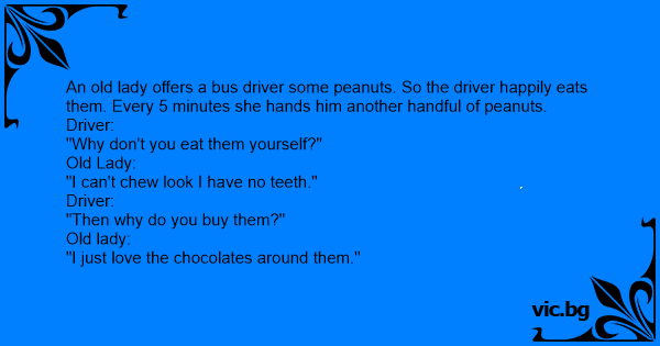 An old lady offers a bus driver some peanuts. So the driver happily eats them. Every 5 minutes she hands him another handful of peanuts.
