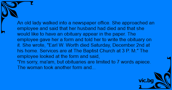 An old lady walked into a newspaper office. She approached an employee and said that her husband had died and that she would like to have an obituary appear in the paper. The employee gave her a form and told her to write the obituary on it. She wrote, "Earl W. Worth died Saturday, December 2nd at his home. Services are at The Baptist Church at 3 P. M." The employee looked at the form and said,