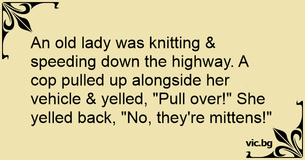 An old lady was knitting & speeding down the highway. A cop pulled up alongside her vehicle & yelled, "Pull over!" She yelled back, "No, they're mittens!"