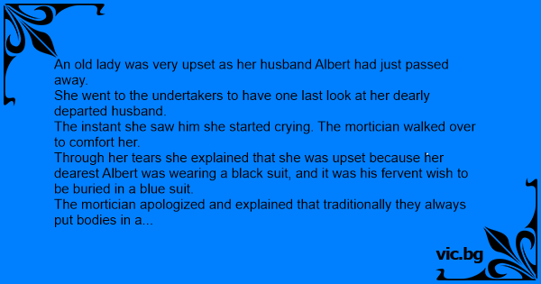 Through her tears she explained that she was upset because her dearest Albert was wearing a black suit, and it was his fervent wish to be buried in a blue suit.