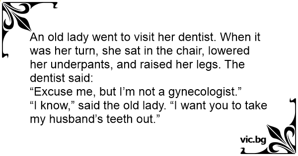 Една баба отива на зъболекар. Сяда на стола и се разкрачва.