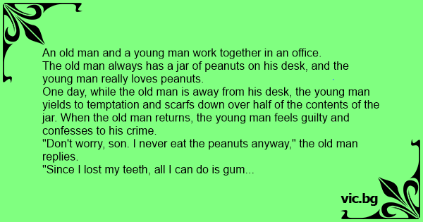 The old man always has a jar of peanuts on his desk, and the young man really loves peanuts.