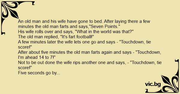 After about five minutes the old man farts again and says - "Touchdown, I'm ahead 14 to 7!"