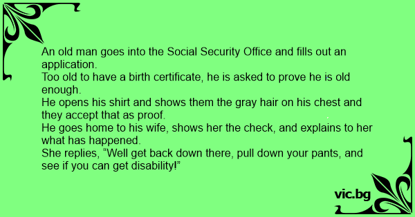 She replies, “Well get back down there, pull down your pants, and see if you can get disability!”