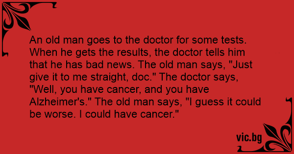 An old man goes to the doctor for some tests. When he gets the results, the doctor tells him that he has bad news. The old man says, "Just give it to me straight, doc." The doctor says, "Well, you have cancer, and you have Alzheimer's." The old man says, "I guess it could be worse. I could have cancer."