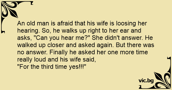 An old man is afraid that his wife is loosing her hearing. So, he walks up right to her ear and asks, "Can you hear me?" She didn't answer. He walked up closer and asked again. But there was no answer. Finally he asked her one more time really loud and his wife said, "For the third time yes!!!"