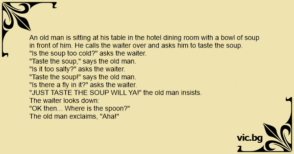 An old man is sitting at his table in the hotel dining room with a bowl of soup in front of him. He calls the waiter over and asks him to taste the soup.