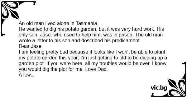 He wanted to dig his potato garden, but it was very hard work. His only son, Jase, who used to help him, was in prison. The old man wrote a letter to his son and described his predicament.