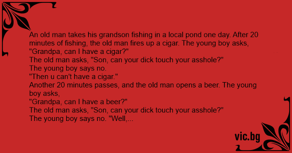 An old man takes his grandson fishing in a local pond one day. After 20 minutes of fishing, the old man fires up a cigar. The young boy asks, "Grandpa, can I have a cigar?" The old man asks, "Son, can your diск touch your аsshоlе?" The young boy says no. "Then u can't have a cigar." Another 20 minutes passes, and the old man opens a вееr. The young boy asks, "Grandpa, can I have a вееr?" The old man asks, "Son, can your diск touch your аsshоlе?" The young boy says no. "Well, then u can't have a вееr." Another 20 minutes passes, and the young boy opens a bag of potato сhiрs. The old man asks, "Son, can I have some of your сhiрs?" The boy asks, "Well, Grandpa, can your diск touch your аsshоlе?" The old man says, "It sure can." The boy says, "Well good, then go fuск yourself, these are my сhiрs."