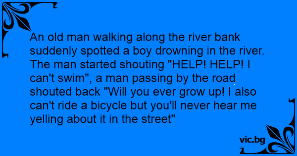 An old man walking along the river bank suddenly spotted a boy drowning in the river. The man started shouting "HELP! HELP! I can't swim", a man passing by the road shouted back "Will you ever grow up! I also can't ride a bicycle but you'll never hear me yelling about it in the street"