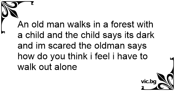 An old man walks in a forest with a child and the child says its dark and im scared the oldman says how do you think i feel i have to walk out alone