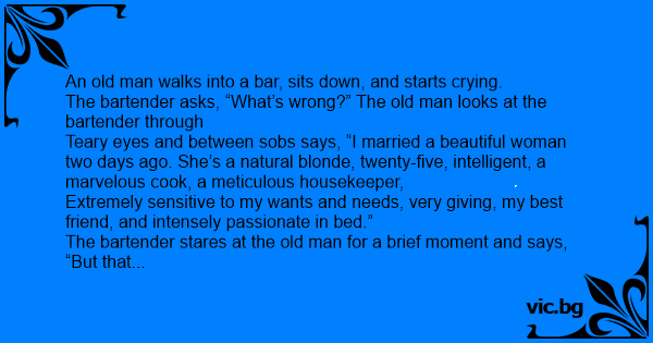 The bartender stares at the old man for a brief moment and says, “But that sounds great! You have what every man wants in a woman, so why are crying?”