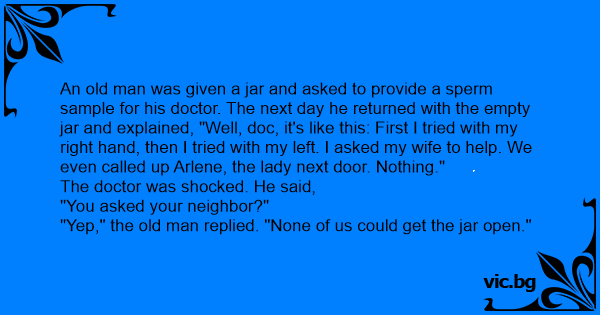 Bir gün ihtiyar bir adam, sperm testi yaptırmak için doktora gider. Doktor adama bir kavanoz verir şöyle der: ─ Buna numune için sperm koyun, yarın bana getirin. Ertesi gün ihtiyar adam kavanozu...