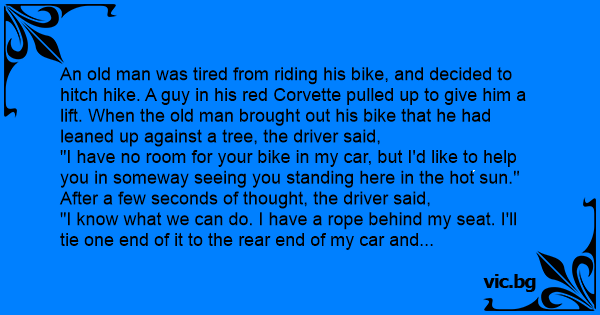 An old man was tired from riding his bike, and decided to hitch hike. A guy in his red Corvette pulled up to give him a lift. When the old man brought out his bike that he had leaned up against a tree, the driver said,