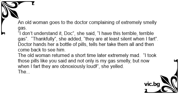 Една старица отива на лекар. Той я пита какъв е проблема и. Старата жена казва: