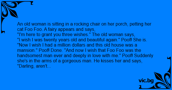 An old woman is sitting in a rocking chair on her porch, petting her cat Foo Foo. A fairy appears and says,