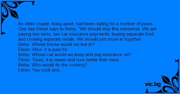 An older couple, living apart, had been dating for a number of years. One day Elmer says to Betsy, “We should stop this nonsense. We are paying two rents, two car insurance payments, buying separate food and cooking separate meals. We should just move in together.