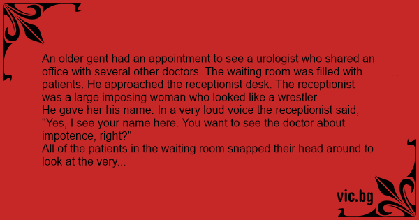 An older gent had an appointment to see a urologist who shared an office with several other doctors. The waiting room was filled with patients. He approached the receptionist desk. The receptionist was a large imposing woman who looked like a wrestler.