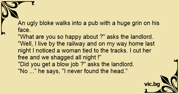Een lelijke kerel komt een bar binnen met een enorme grijns op zijn gezicht. “Waarom ben jij zo blij?” vraagt de barman. “Nou”, antwoordt de man, “ik woon vlakbij de spoorlijn en bij thuiskomst...
