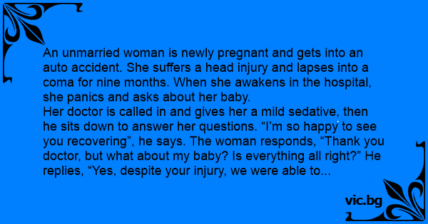 Her doctor is called in and gives her a mild sedative, then he sits down to answer her questions. “I’m so happy to see you recovering”, he says. The woman responds, “Thank you doctor, but what about my baby? Is everything all right?” He replies, “Yes, despite your injury, we were able to perform a fairly normal delivery procedure.”