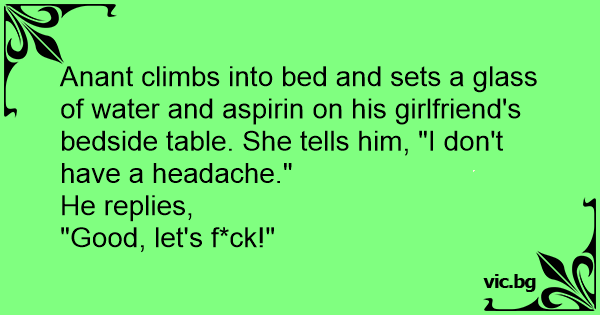 Anant climbs into bed and sets a glass of water and aspirin on his girlfriend's bedside table. She tells him, "I don't have a headache."