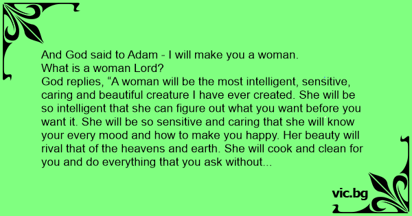 God replies, “A woman will be the most intelligent, sensitive, caring and beautiful creature I have ever created. She will be so intelligent that she can figure out what you want before you want it. She will be so sensitive and caring that she will know your every mood and how to make you happy. Her beauty will rival that of the heavens and earth. She will cook and clean for you and do everything that you ask without complaining. She will provide every sеxuаl fantasy you will ever think of and meet all your sеxuаl needs. She will bear your children and raise them without complaints. This woman will be the perfect companion for you.”