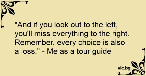 "And if you look out to the left, you'll miss everything to the right. Remember, every choice is also a loss." - Me as a tour guide
