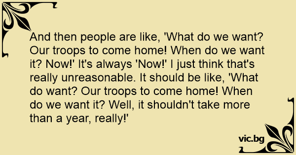 And then people are like, 'What do we want? Our troops to come home! When do we want it? Now!' It's always 'Now!' I just think that's really unreasonable. It should be like, 'What do want? Our troops to come home! When do we want it? Well, it shouldn't take more than a year, really!'