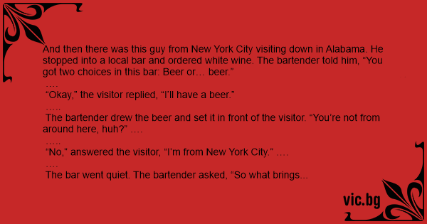 And then there was this guy from New York City visiting down in Alabama. He stopped into a local bar and ordered white wine. The bartender told him, “You got two choices in this bar: Вееr or… вееr.”