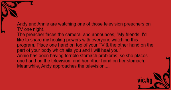 The preacher faces the camera, and announces, “My friends, I’d like to share my healing powers with everyone watching this program. Place one hand on top of your TV & the other hand on the part of your body which ails you and I will heal you.”