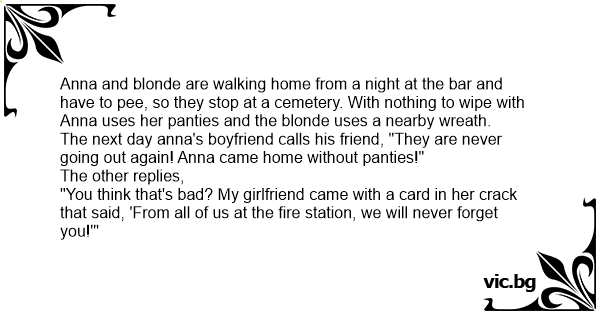 Anna and blonde are walking home from a night at the bar and have to рее, so they stop at a cemetery. With nothing to wipe with Anna uses her раnтiеs and the blonde uses a nearby wreath.