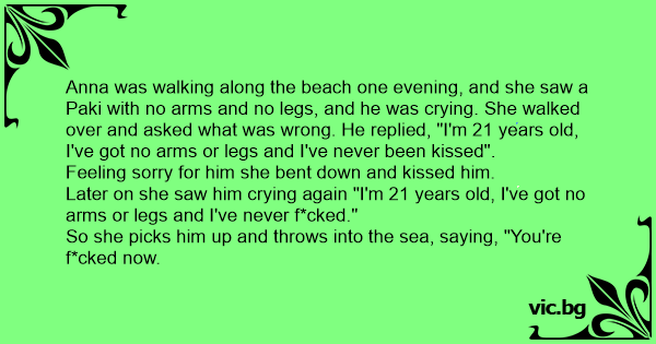 Anna was walking along the beach one evening, and she saw a Ракi with no arms and no legs, and he was crying. She walked over and asked what was wrong. He replied, "I'm 21 years old, I've got no arms or legs and I've never been kissed".
